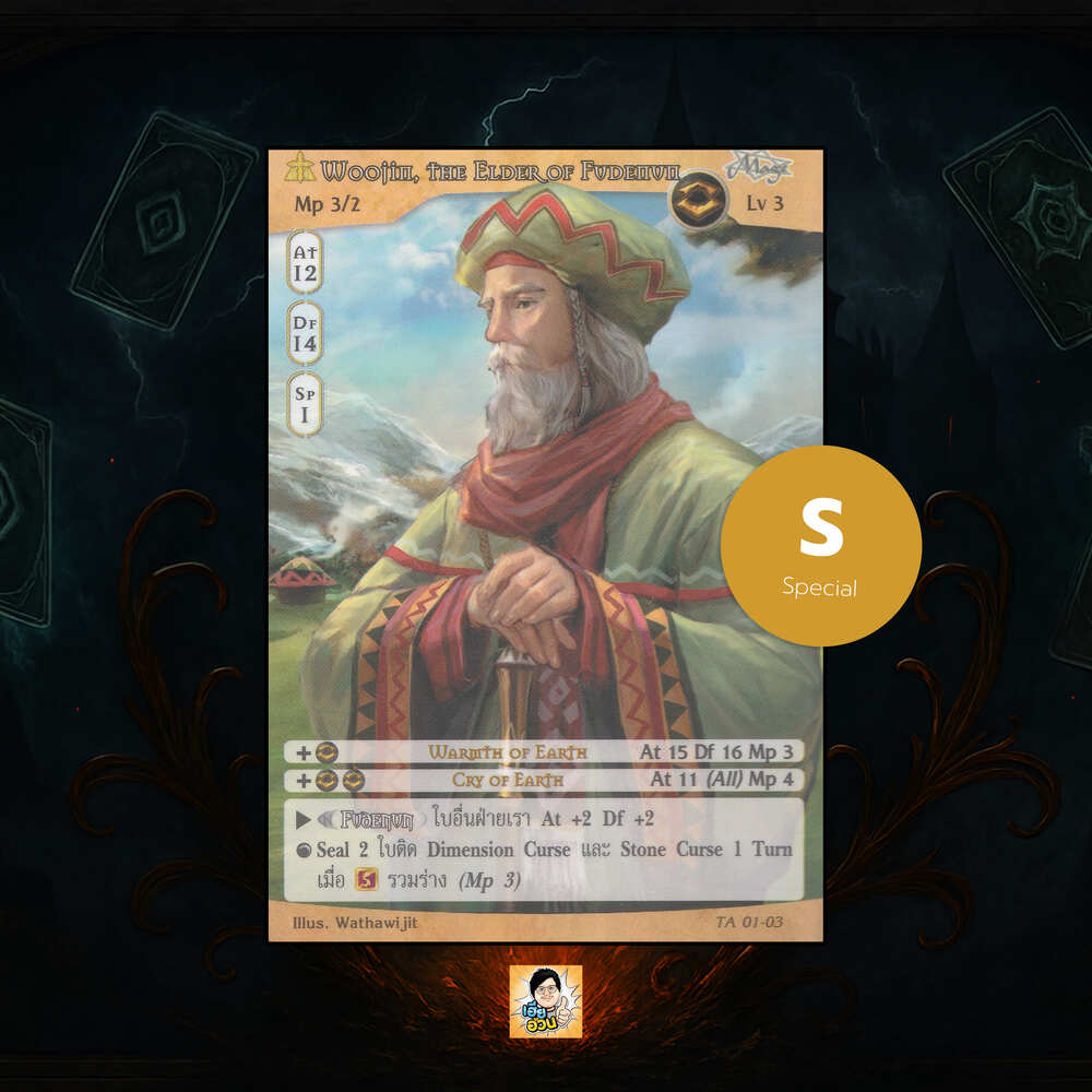 เป็นการ์ดเกม “Summoner Master OG” ในชุด “Tenth Anniversary” นี้จะมีการ์ดทั้งหมด 100 แบบ “Woojin, the Elder of Fudenun” เป็น Seal Card ธาตุ Earth ประเภท Mage หมายเลข 01-03 ระดับการค้นหา Special