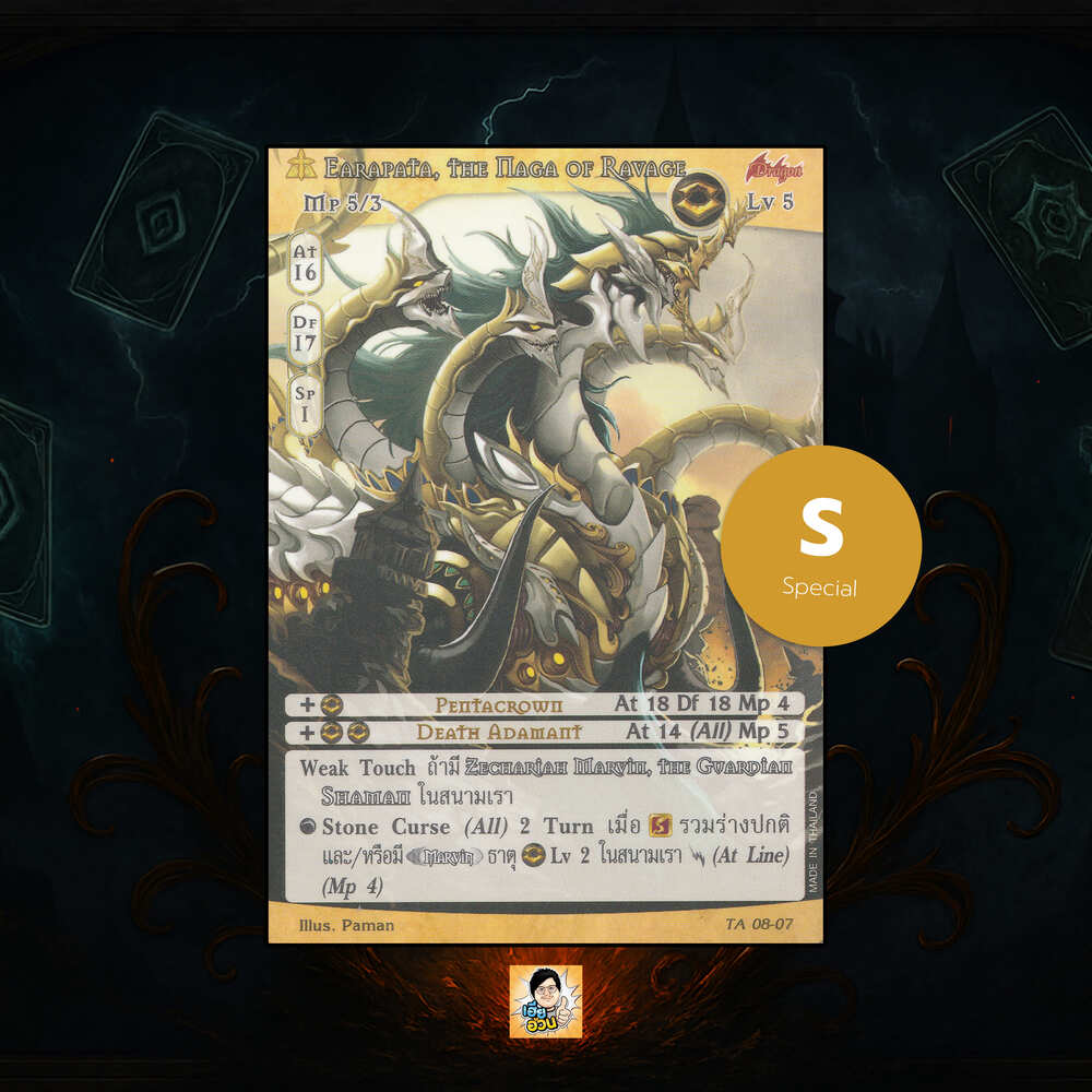 เป็นการ์ดเกม “Summoner Master OG” ในชุด “Tenth Anniversary” นี้จะมีการ์ดทั้งหมด 100 แบบ “Earapata, the Naga of Ravage” เป็น Seal Card ธาตุ Earth ประเภท Dragon หมายเลข 08-07 ระดับการค้นหา Special