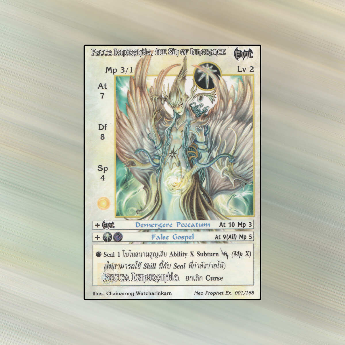 เป็นการ์ดเกม Summoner Master OG ในชุด Neo Prophet Extended นี้จะมีการ์ดทั้งหมด 169 แบบ “Pecca Ignorantia, the Sin of Ignorance” เป็น Seal Card ธาตุ Light เผ่าพันธุ์ Evil หมายเลข 1 ระดับการค้นหา Rare