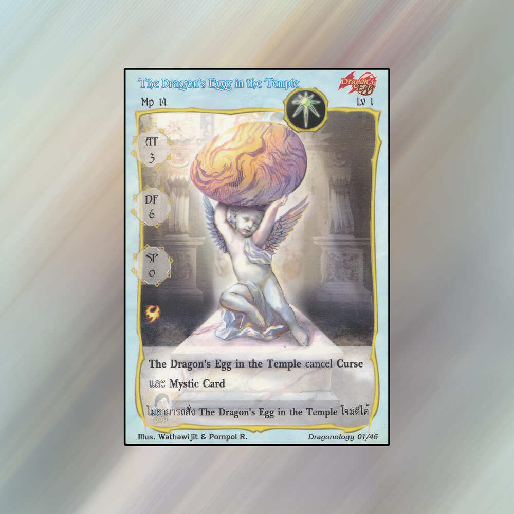 เป็นการ์ดเกม Summoner Master OG ในชุด Dragonology นี้จะมีการ์ดทั้งหมด 48 แบบ The Dragon’s Egg in the Temple เป็น Seal Card ธาตุแสง เผ่าไข่มังกร หมายเลข 1: ระดับการค้นหาเป็นการ์ดพิเศษ