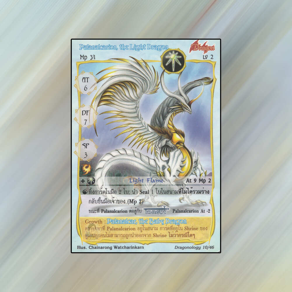 เป็นการ์ดเกม Summoner Master OG ในชุด Dragonology นี้จะมีการ์ดทั้งหมด 48 แบบ Palanalcarion, the Light Dragon เป็น Seal Card ธาตุแสง เผ่ามังกร หมายเลข 10: ระดับการค้นหาเป็นการ์ดพิเศษ