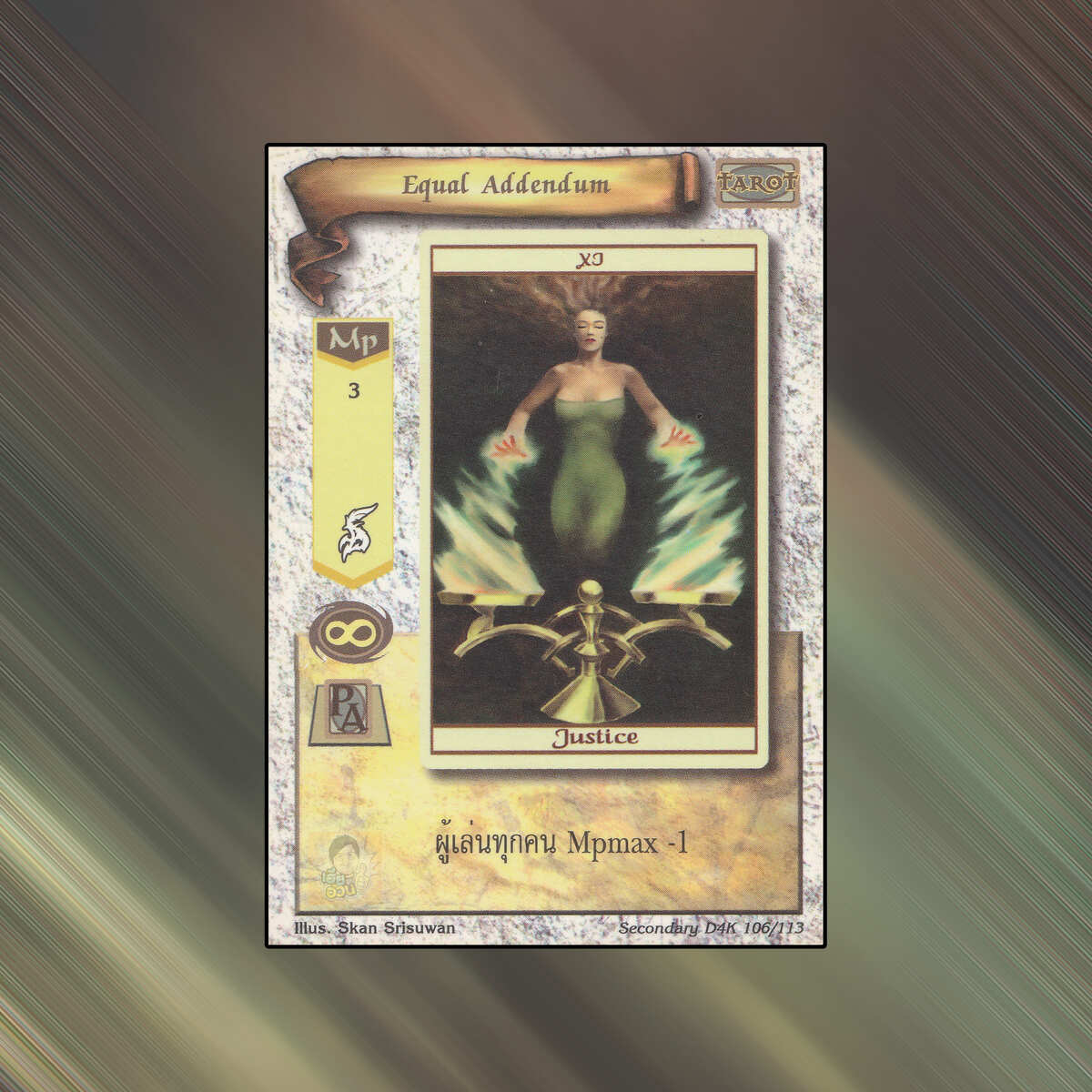 เป็นการ์ดเกม Summoner Master OG ในชุด SecondaryD4K นี้จะมีการ์ดทั้งหมด 114 แบบ Equal Addendum เป็น Mystic Card ชนิด Tarot หมายเลข 106 ระดับการค้นหา Common