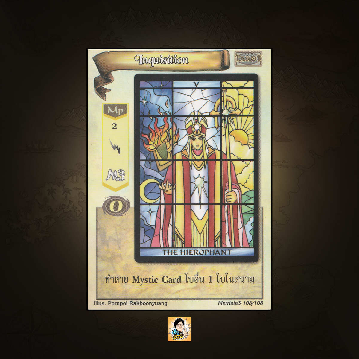 เป็นการ์ดเกม “Summoner Master OG” ในชุด “Merrisia 3rd Impression“ นี้จะมีการ์ดทั้งหมด 108 แบบ “Inquisition” เป็น Mystic Card ประเภท Tarot หมายเลข 108 ระดับการค้นหา Common