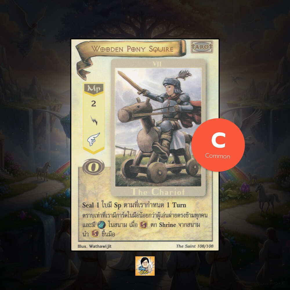 เป็นการ์ดเกม “Summoner Master OG” ในชุด “The Saint” นี้จะมีการ์ดทั้งหมด 108 แบบ “Wooden Pony Squire“ เป็น Mystic Card ประเภท Tarot หมายเลข 108 ระดับการค้นหา Common