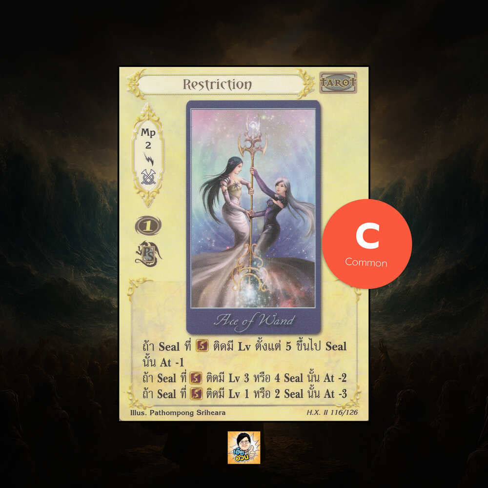 เป็นการ์ดเกม “Summoner Master OG” ในชุด “Hymn of Exodus II” นี้จะมีการ์ดทั้งหมด 138 ใบ “Restriction” เป็น Mystic Card ประเภท Tarot หมายเลข 116 ระดับการค้นหา Common