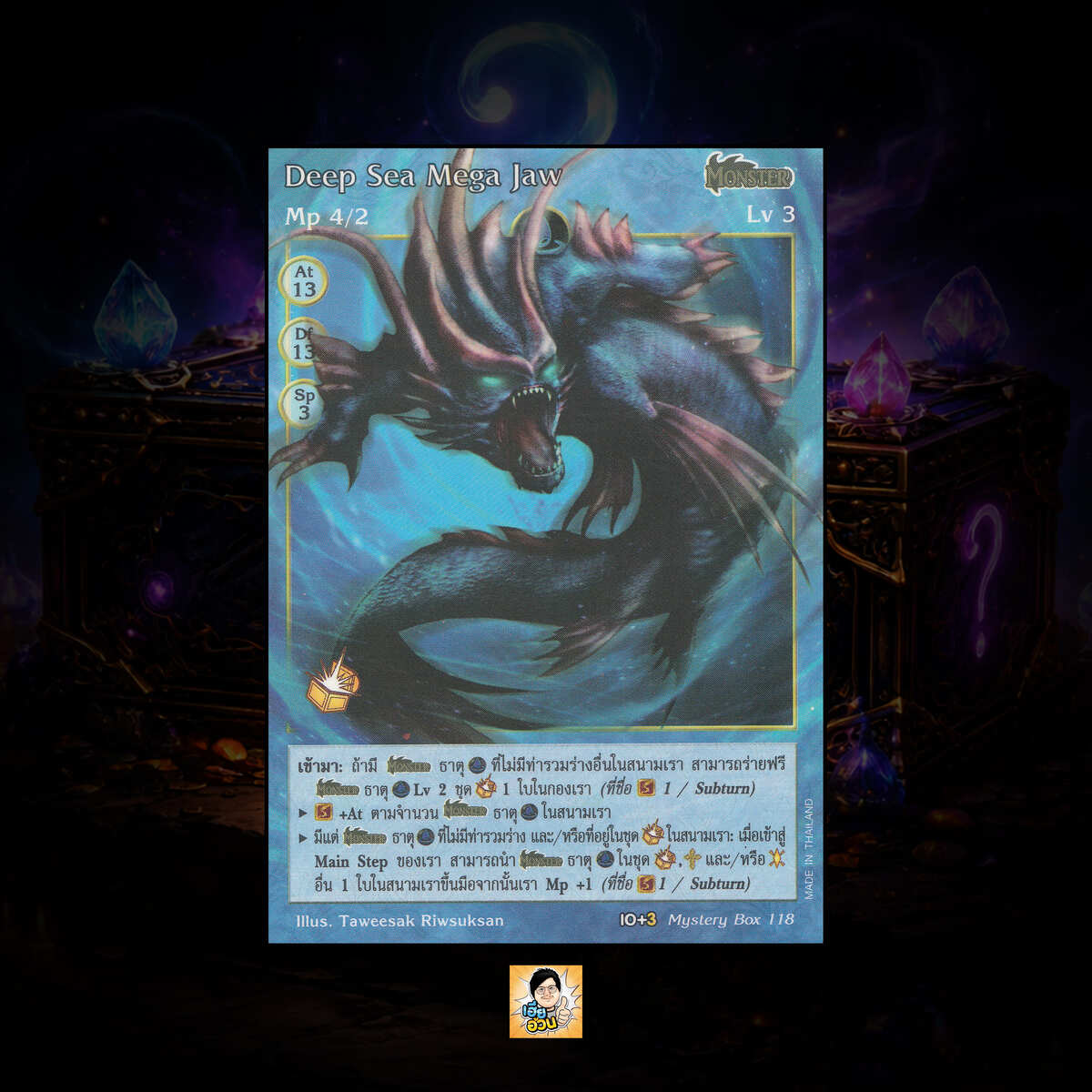 เป็นการ์ดเกม “Summoner Master OG” ในชุด “Mystery Box” นี้จะมีการ์ดทั้งหมด 131 แบบ “Deep Sea Mega Jaw” เป็น Seal Card ธาตุ Water ประเภท Monster หมายเลข 118 ระดับการค้นหา Special
