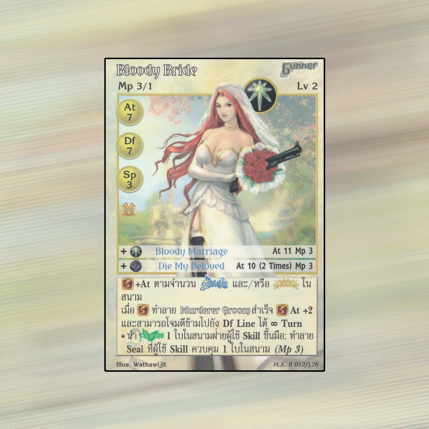 เป็นการ์ดเกม Summoner Master OG ในชุด Hymn of Exodus II นี้จะมีการ์ดทั้งหมด 138 แบบ Bloody Bride เป็น Seal Card ธาตุแสง เผ่าพันธุ์มือปืน หมายเลข 12 ระดับการค้นหาเป็นการ์ดหายาก