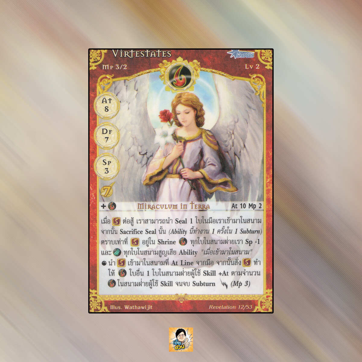 เป็นการ์ดเกม Summoner Master OG ในชุด Revelation นี้จะมีการ์ดทั้งหมด 54 แบบ “Virtestates” เป็น Seal Card ธาตุ Fire เผ่าพันธุ์ Divine หมายเลข 12 ระดับการค้นหา Special
