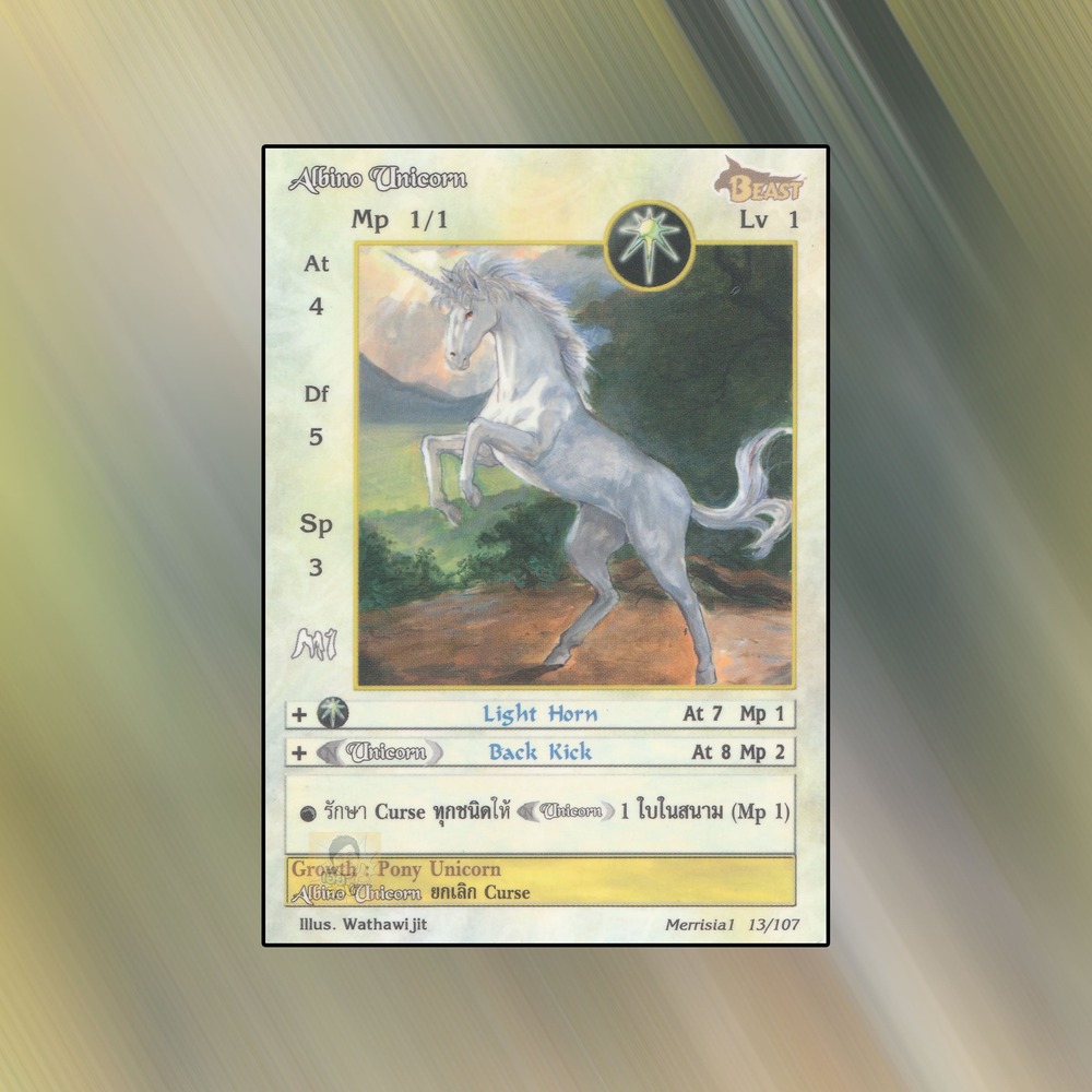 เป็นการ์ดเกม Summoner Master OG ในชุด Merrisia 1st Impression นี้จะมีการ์ดทั้งหมด 108 แบบ Albino Unicorn เป็น Seal Card ธาตุแสง เผ่าสัตว์เดรัจฉาน หมายเลข 13: ระดับการค้นหาเป็นการ์ดทั่วไป