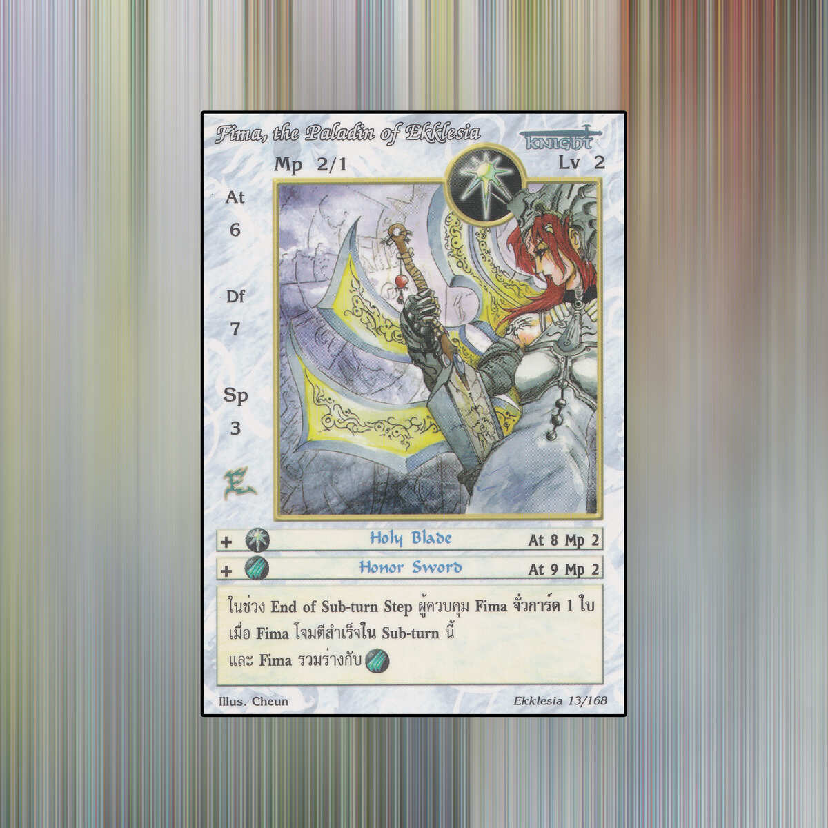 เมื่อ Fima, the Paladin of Ekklesia โจมตีสำเร็จ เมื่อจบ Subturn นี้ เราจั่วการ์ด 1 ใบ เมื่อ Fima, the Paladin of Ekklesia รวมร่างกับ ![]()