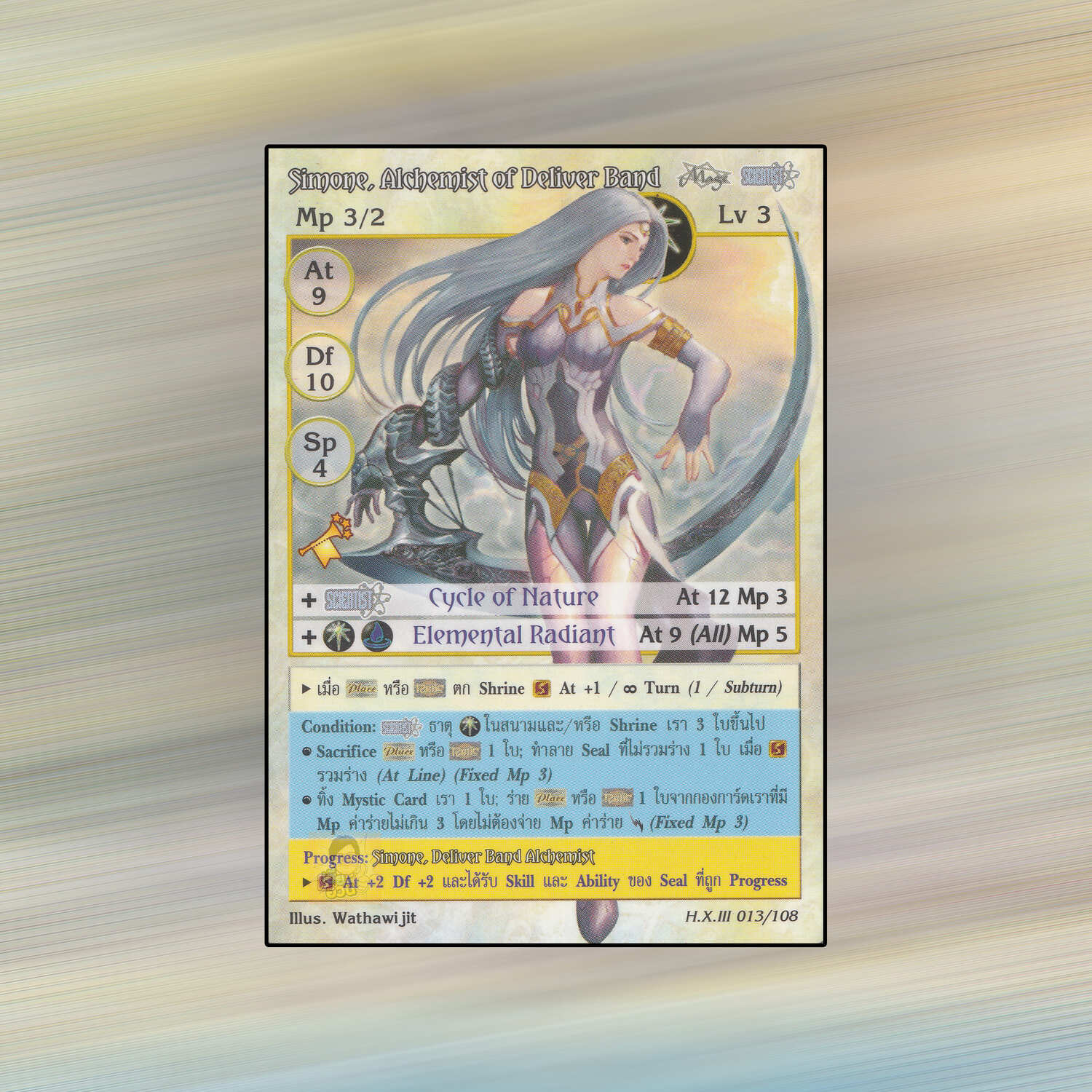 เป็นการ์ดเกม Summoner Master OG ในชุด Hymn of Exodus III นี้จะมีการ์ดทั้งหมด 126 แบบ Simone, Alchemist of Deliver Band เป็น Seal Card ธาตุแสง เผ่าพันธุ์นักวิทยาศาสตร์จอมเวท หมายเลข 13 ระดับการค้นหาเป็นการ์ดหายาก