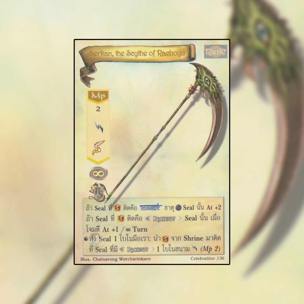 เป็นการ์ดเกม Summoner Master OG ในชุด Celebration นี้จะมีการ์ดทั้งหมด 235 ใบ Serkan, the Scythe of Rachoyu เป็น Mystic Card ประเภทสิ่งศักดิ์สิทธิ์ หมายเลข 136: ระดับการค้นหาเป็นการ์ดโปรโมชัน