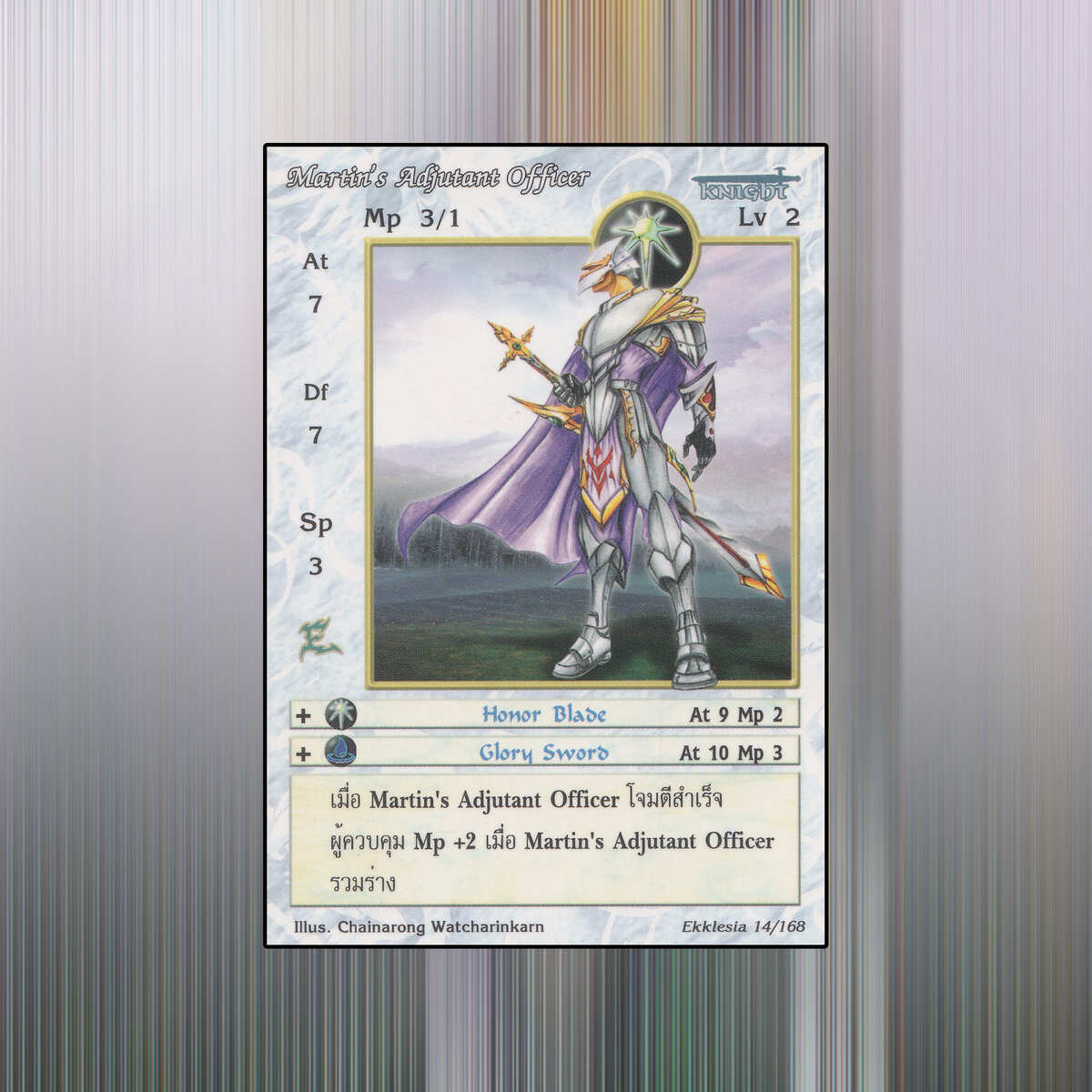 เป็นการ์ดเกม Summoner Master OG ในชุด Ekklesia นี้จะมีการ์ดทั้งหมด 168 แบบ Martin’s Adjutant Officer เป็น Seal Card ธาตุ Light เผ่าพันธุ์ Knight หมายเลข 14 ระดับการค้นหา Uncommon
