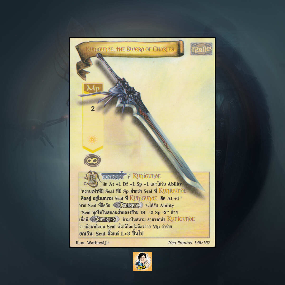 เป็นการ์ดเกม “Summoner Master OG” ในชุด “Neo Prophet” นี้จะมีการ์ดทั้งหมด 168 แบบ “Kunigunde, the Sword of Charles” เป็น Mystic Card ประเภท Relic หมายเลข 148 ระดับการค้นหา Rare