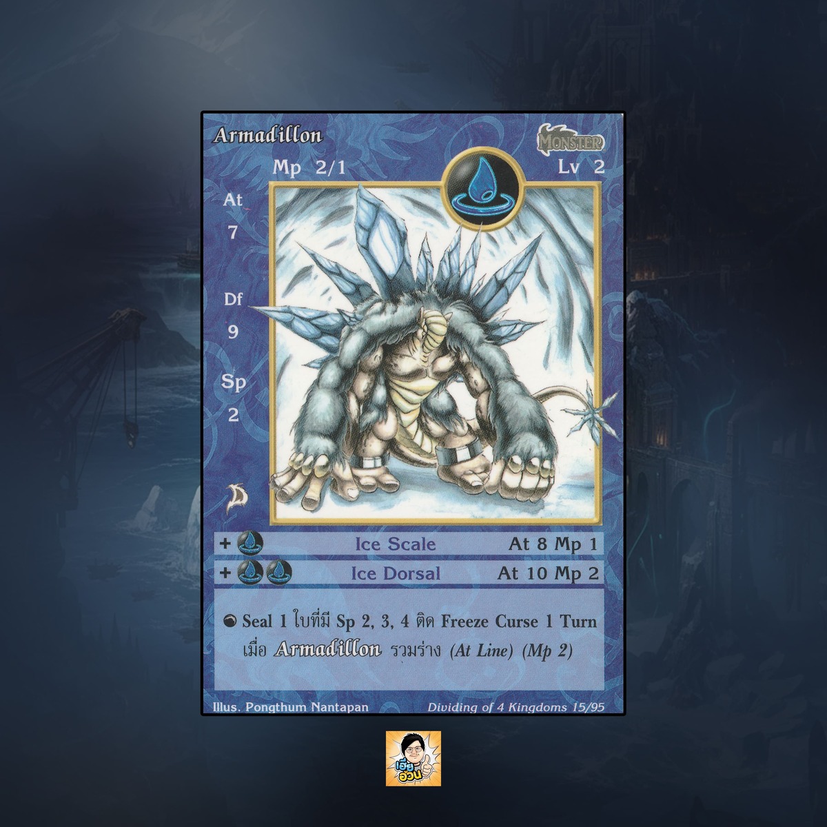 เป็นการ์ดเกม “Summoner Master OG” ในชุด “Dividing of 4 Kingdoms” นี้จะมีการ์ดทั้งหมด 105 แบบ “Armadillon” เป็น Seal Card ธาตุ Water เผ่าพันธุ์ Monster หมายเลข 15 ระดับการค้นหา Common