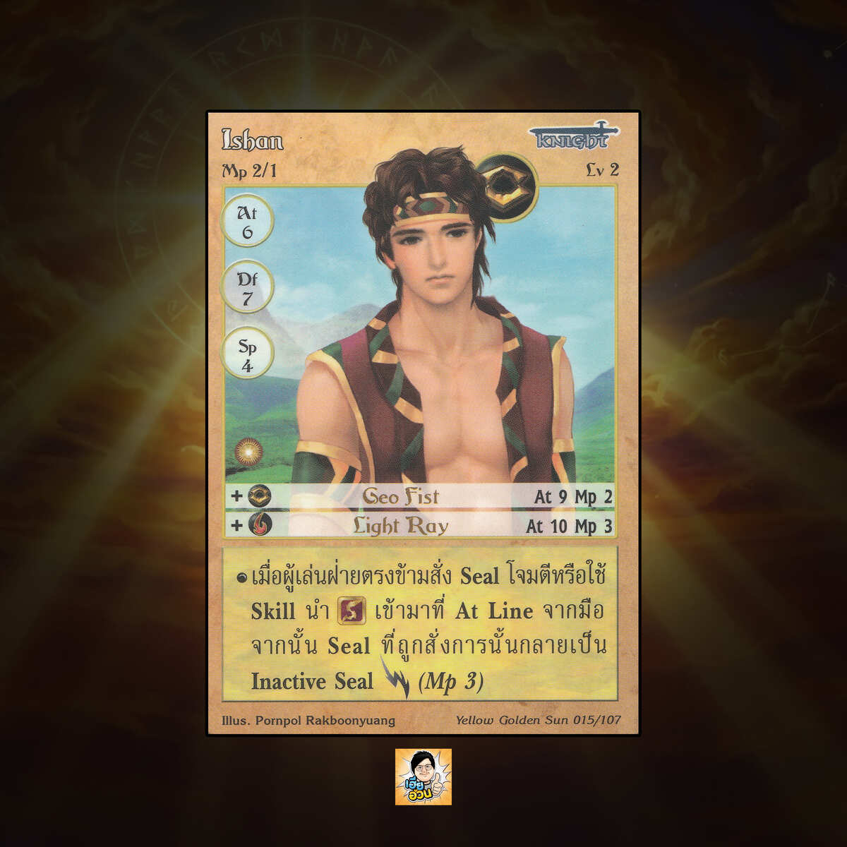 เป็นการ์ดเกม “Summoner Master OG” ในชุด “Yellow Golden Sun” นี้จะมีการ์ดทั้งหมด 108 แบบ “Ishan” เป็น Seal Card ธาตุ Earth เผ่าพันธุ์ Knight หมายเลข 15 ระดับการค้นหา Rare