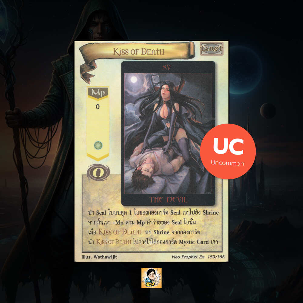 เป็นการ์ดเกม “Summoner Master OG” ในชุด “Neo Prophet Extended” นี้จะมีการ์ดทั้งหมด 169 แบบ “Kiss of Death” เป็น Mystic Card ชนิด Tarot หมายเลข 159 ระดับการค้นหา Uncommon