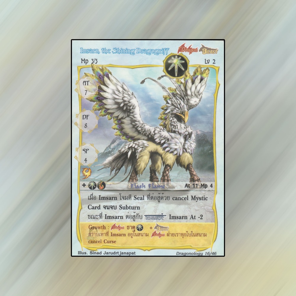 เป็นการ์ดเกม Summoner Master OG ในชุด Dragonology นี้จะมีการ์ดทั้งหมด 48 แบบ Imsarn, the Shining Dragogriff เป็น Seal Card ธาตุแสง เผ่ามังกรอสูร หมายเลข 16: ระดับการค้นหาเป็นการ์ดพิเศษ