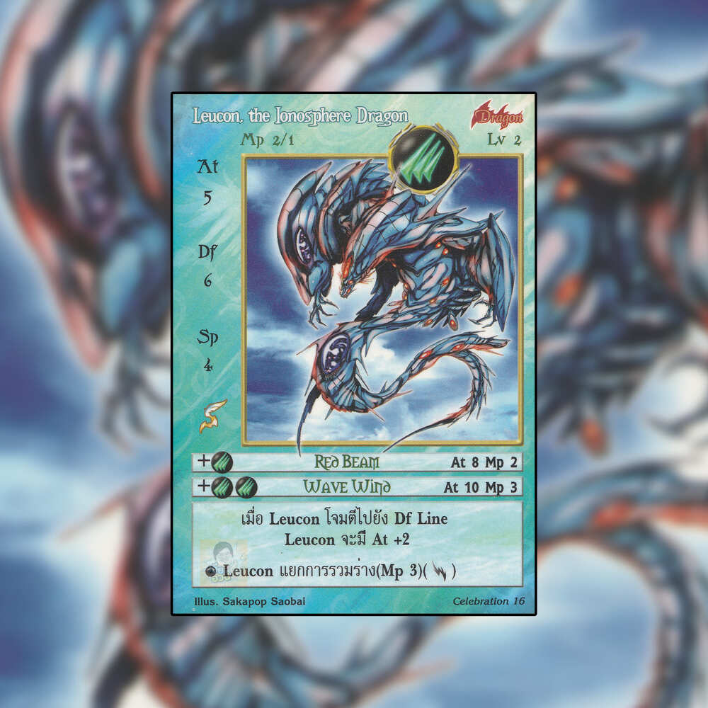 เป็นการ์ดเกม Summoner Master OG ในชุด Celebration นี้จะมีการ์ดทั้งหมด 235 ใบ Leucon, the Ionosphere Dragon เป็น Seal Cards ธาตุลม เผ่ามังกร หมายเลข 16: ระดับการค้นหาเป็นการ์ดโปรโมชัน