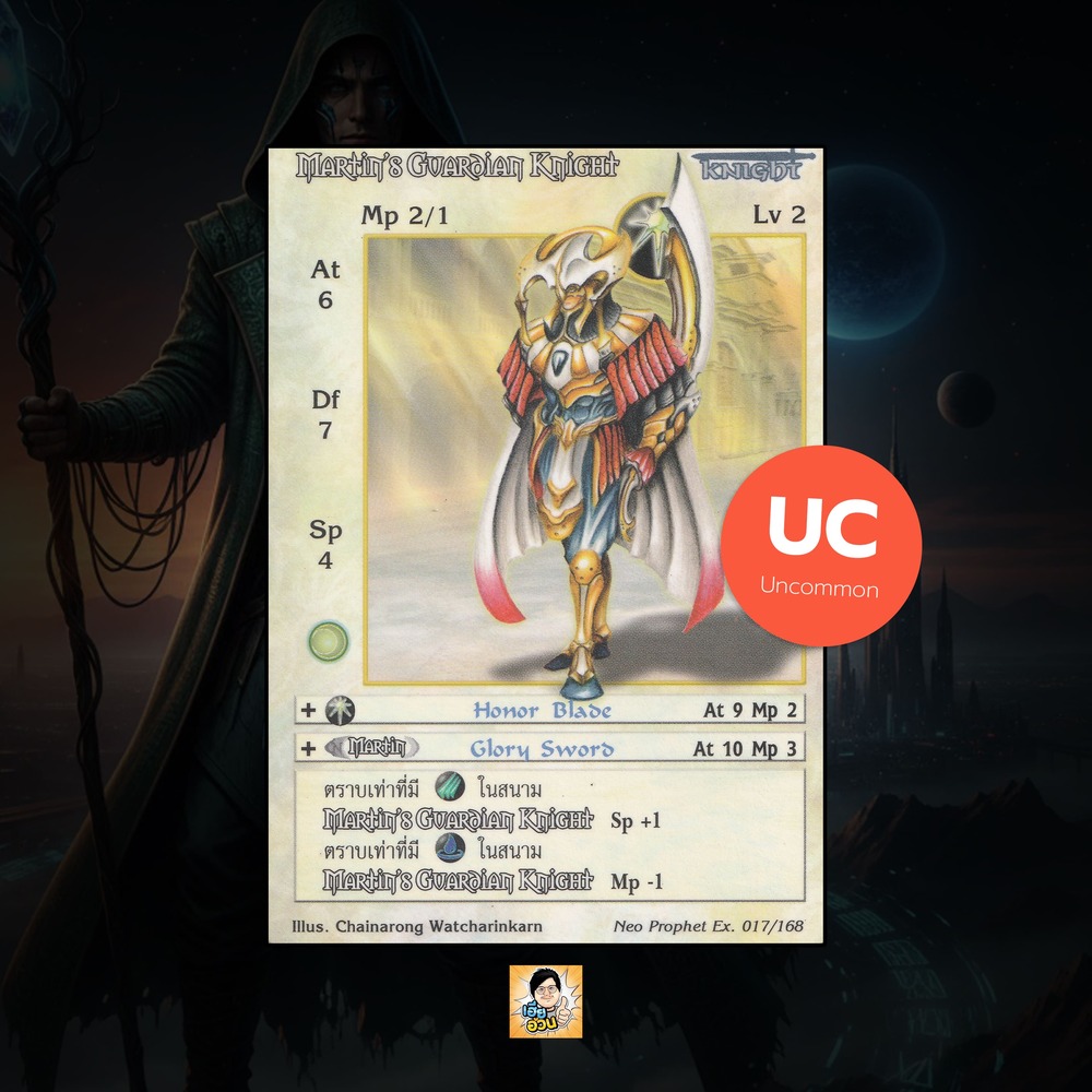 เป็นการ์ดเกม “Summoner Master OG” ในชุด “Neo Prophet Extended” นี้จะมีการ์ดทั้งหมด 169 แบบ “Martin’s Guardian Knight” เป็น Seal Card ธาตุ Light เผ่าพันธุ์ Knight หมายเลข 17 ระดับการค้นหา Uncommon