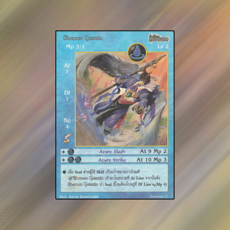เป็นการ์ดเกม Summoner Master OG ในชุด Treasure นี้จะมีการ์ดทั้งหมด 314 ใบ Shaman Garuda เป็น Seal Cards ธาตุน้ำ เผ่าสัตว์ประหลาด หมายเลข 17: ระดับการค้นหาเป็นการ์ดโปรโมชัน