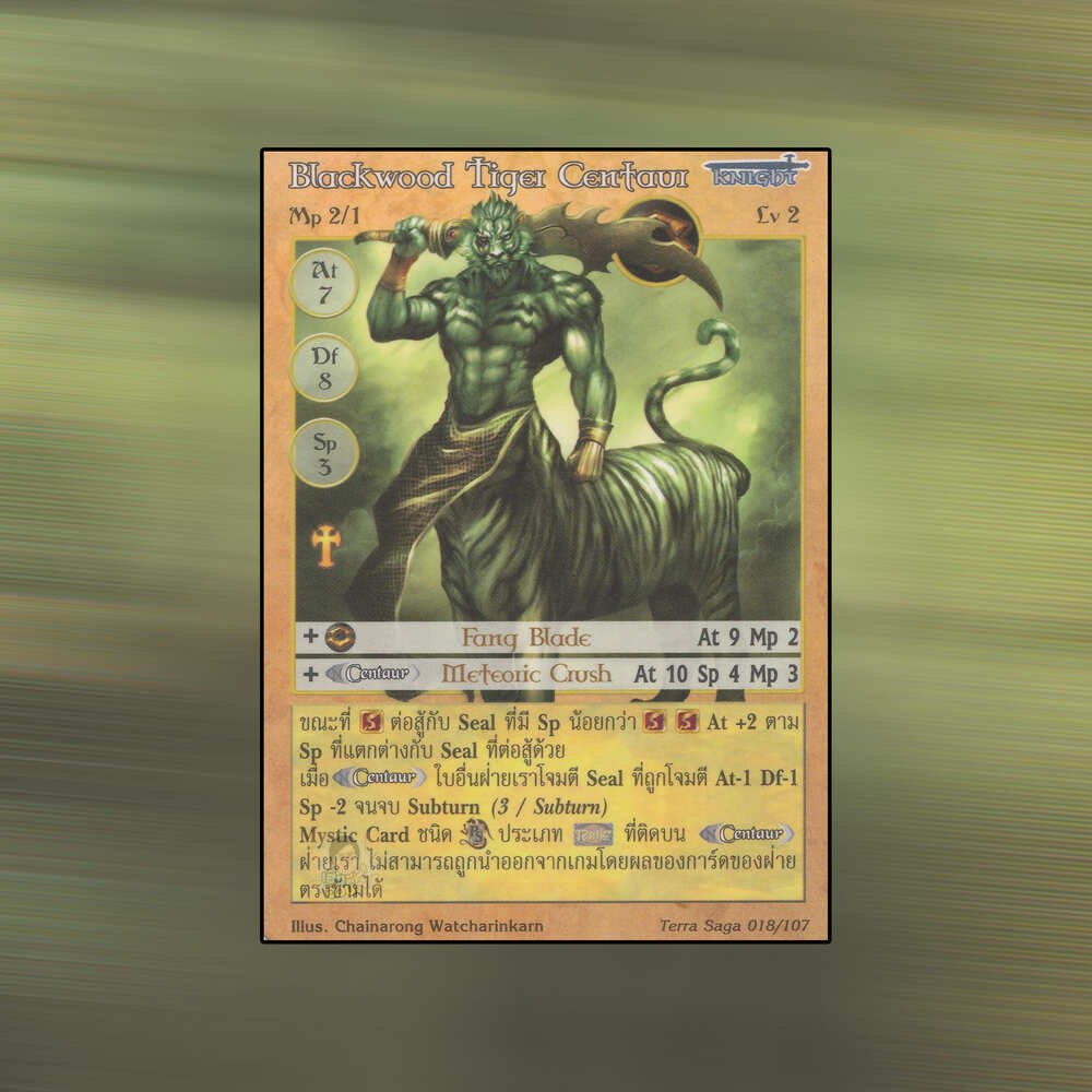 เป็นการ์ดเกม Summoner Master OG ในชุด Terra Saga นี้จะมีการ์ดทั้งหมด 108 แบบ Blackwood Tiger Centaur เป็น Seal Card ธาตุดิน เผ่าอัศวิน หมายเลข 18: ระดับการค้นหาเป็นการ์ดหายาก