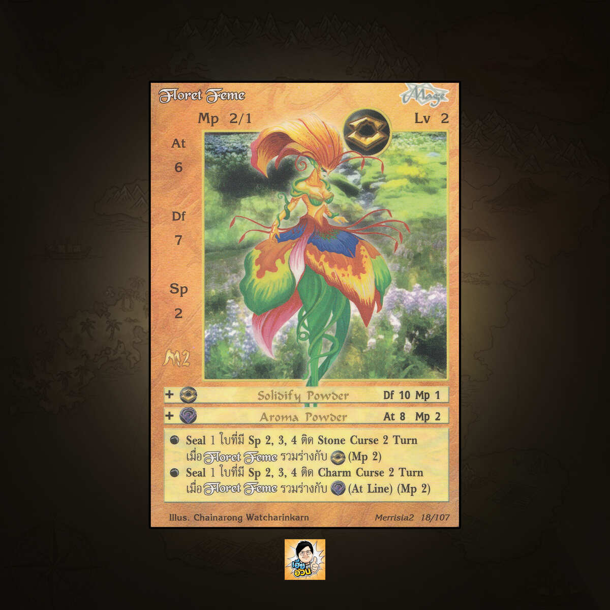 Floret Feme เป็นการ์ดเกม Summoner Master OG ชุด Merrisia 2nd Impression เป็น Seal Card ธาตุ Earth ประเภท Mage หมายเลข 18 ระดับการค้นหา Rare