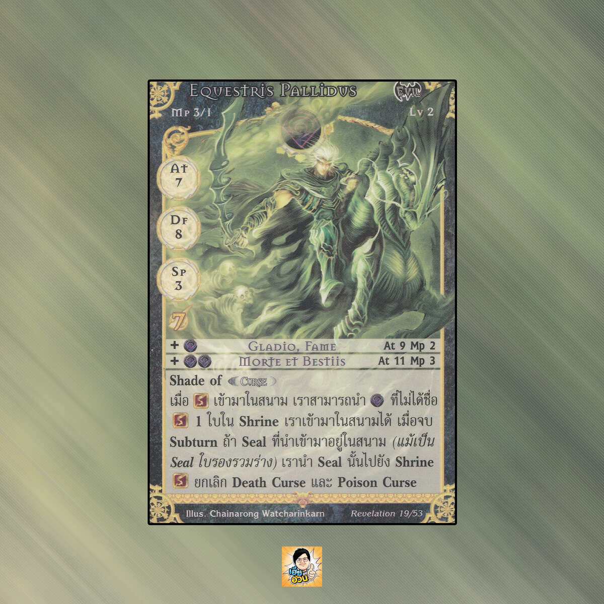 เป็นการ์ดเกม Summoner Master OG ในชุด Revelation นี้จะมีการ์ดทั้งหมด 54 แบบ “Equestris Pallidus” เป็น Seal Card ธาตุ Dark เผ่าพันธุ์ Evil หมายเลข 19 ระดับการค้นหา Special