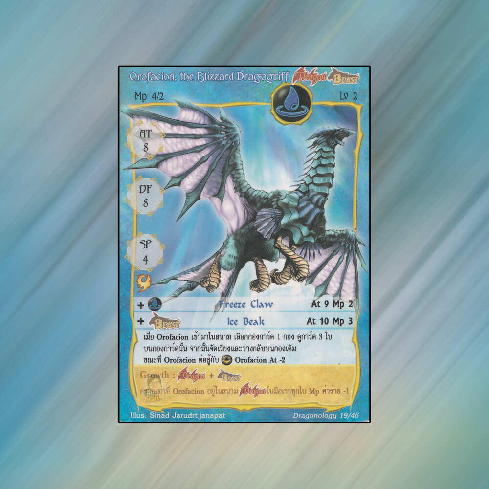 เป็นการ์ดเกม Summoner Master OG ในชุด Dragonology นี้จะมีการ์ดทั้งหมด 48 แบบ Orofacion, the Blizzard Dragogriff เป็น Seal Card ธาตุน้ำ เผ่ามังกรอสูร หมายเลข 19: ระดับการค้นหาเป็นการ์ดพิเศษ