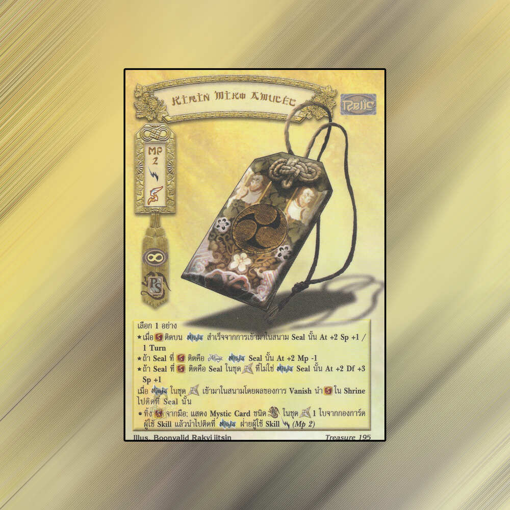 เป็นการ์ดเกม Summoner Master OG ในชุด Treasure นี้จะมีการ์ดทั้งหมด 314 ใบ Kirin Miko Amulet เป็น Mystic Card ประเภทสิ่งศักดิ์สิทธิ์ หมายเลข 195: ระดับการค้นหาเป็นการ์ดโปรโมชัน