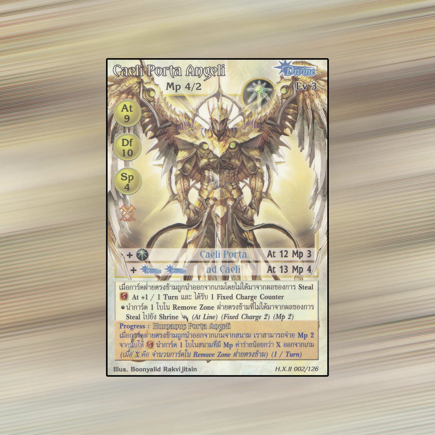 เป็นการ์ดเกม Summoner Master OG ในชุด Hymn of Exodus II นี้จะมีการ์ดทั้งหมด 138 แบบ Caeli Porta Angeli เป็น Seal Card ธาตุแสง เผ่าพันธุ์เทพเจ้า หมายเลข 2 ระดับการค้นหาเป็นการ์ดหายาก