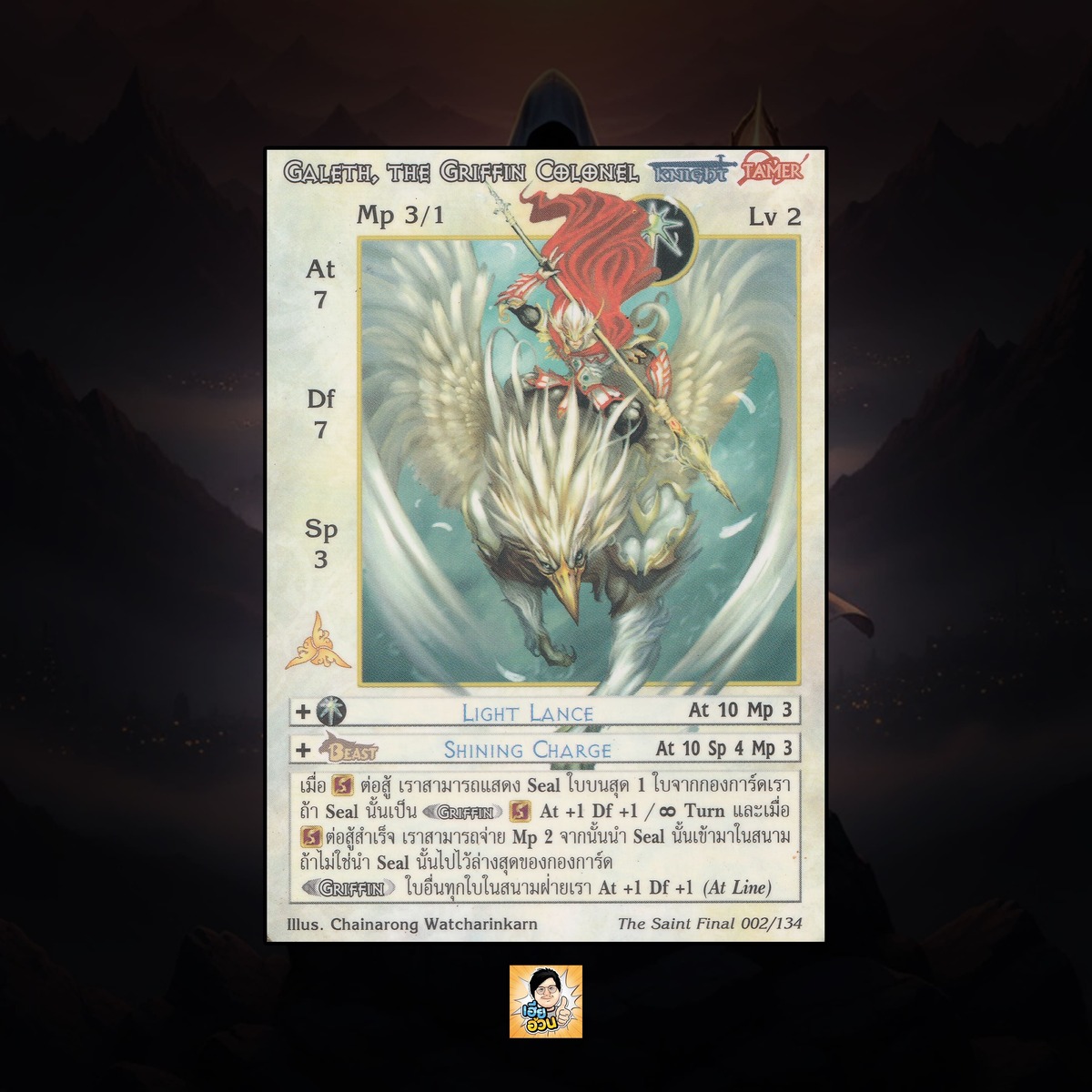 เป็นการ์ดเกม Summoner Master OG ในชุด The Saint Final นี้จะมีการ์ดทั้งหมด 135 แบบ “Galeth, the Griffin Colonel” เป็น Seal Card ธาตุ Light เผ่าพันธุ์ Knight Tamer หมายเลข 2 ระดับการค้นหา Rare