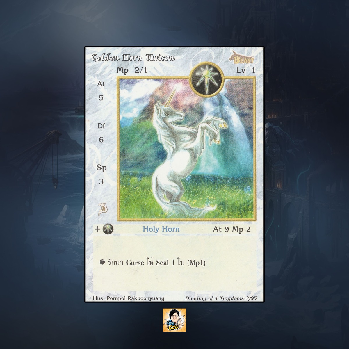 ในชุด “Dividing of 4 Kingdoms” นี้จะมีการ์ดทั้งหมด 105 แบบ “Golden Horn Unicorn” เป็น Seal Cards หมายเลข 2 ธาตุแสง เผ่าสัตว์เดรัจฉาน: ระดับการค้นหาเป็นทั่วไป