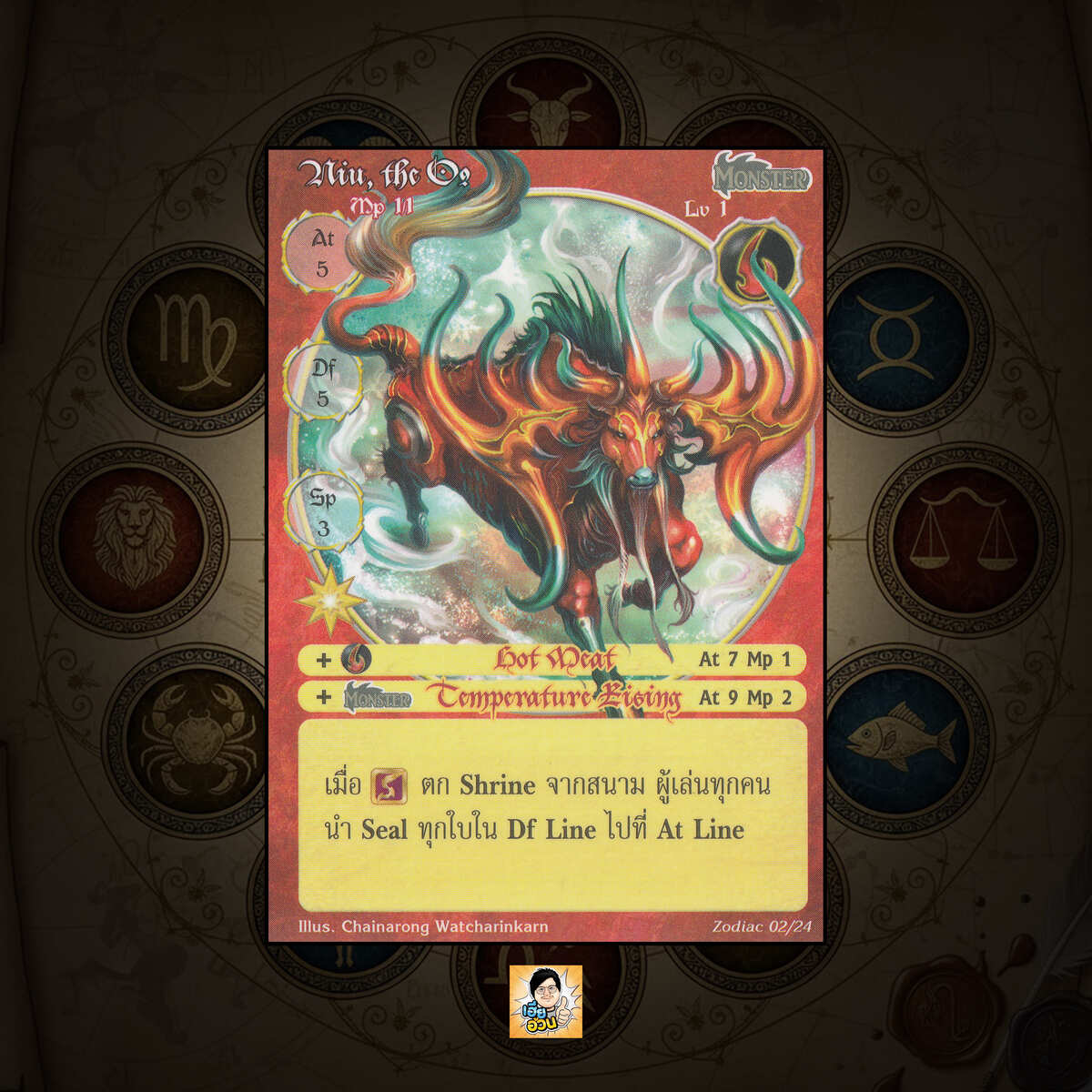 เป็นการ์ดเกม “Summoner Master OG” ในชุด “Zodiac” นี้จะมีการ์ดทั้งหมด 24 แบบ “Niu, the Ox” เป็น Seal Card ธาตุ Fire เผ่าพันธุ์ Monster หมายเลข 2 ระดับการค้นหา Special