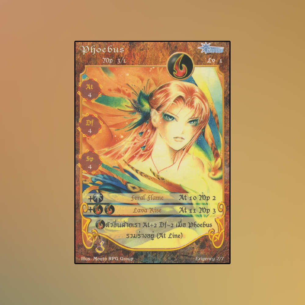 เป็นการ์ดเกม Summoner Master OG ในชุด Exigency นี้จะมีการ์ดทั้งหมด 7 แบบ “Phoebus” เป็น Seal Cards ธาตุไฟ เผ่าเทพเจ้า หมายเลข 2: ระดับการค้นหาเป็นการ์ดพิเศษ