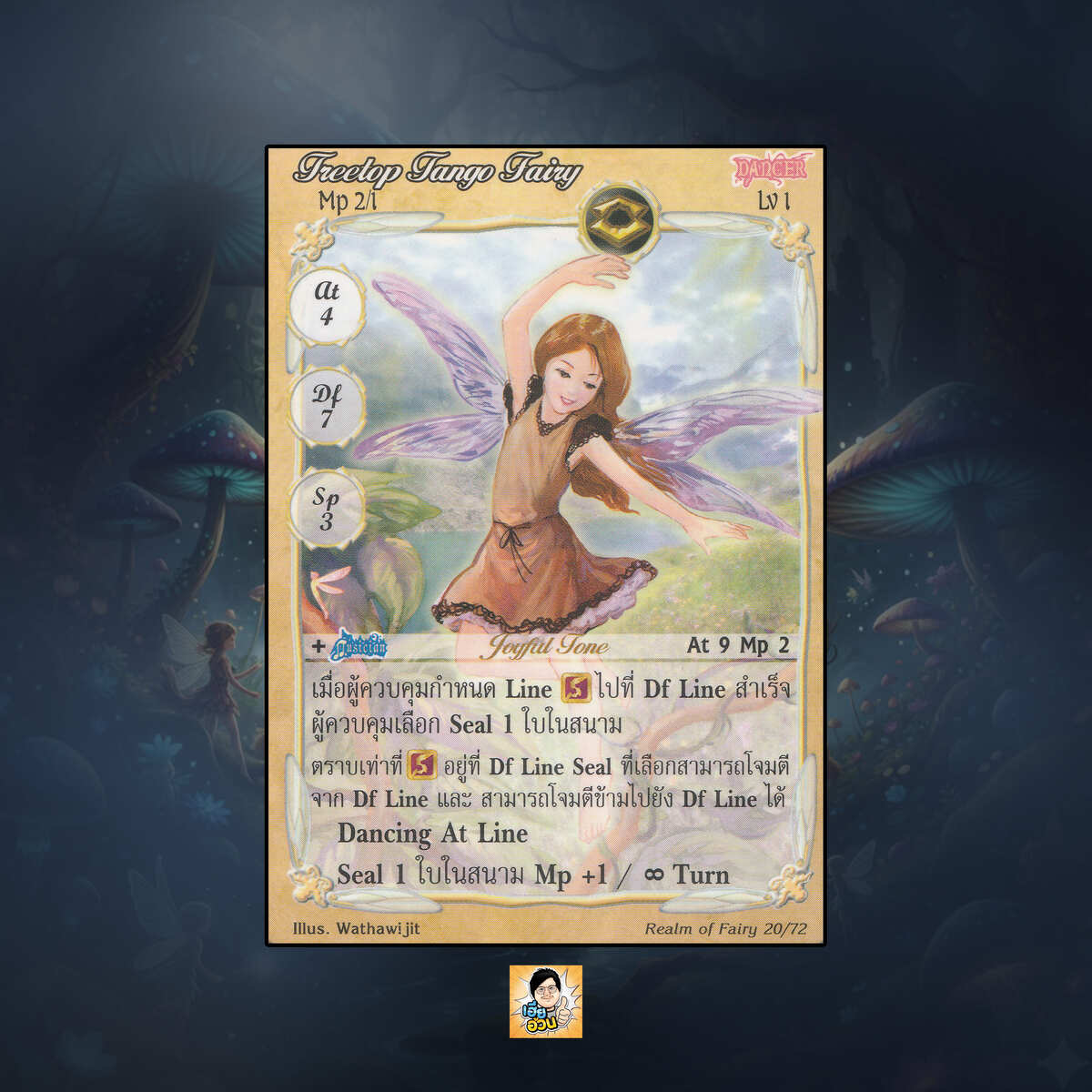 เป็นการ์ดเกม “Summoner Master OG” ในชุด “Realm of Fairy” นี้จะมีการ์ดทั้งหมด 72 แบบ “Treetop Tango Fairy” เป็น Seal Card ธาตุ Earth เผ่าพันธุ์ Dancer หมายเลข 20 ระดับการค้นหา Special