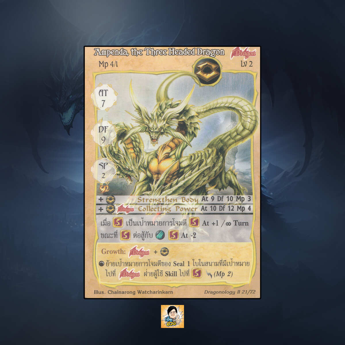 เป็นการ์ดเกม “Summoner Master OG” ในชุด “Dragonology 2” นี้จะมีการ์ดทั้งหมด 73 แบบ “Ampenda, the Three Headed Dragon” เป็น Seal Card ธาตุ Earth เผ่าพันธุ์ Dragon หมายเลข 21 ระดับการค้นหา Special