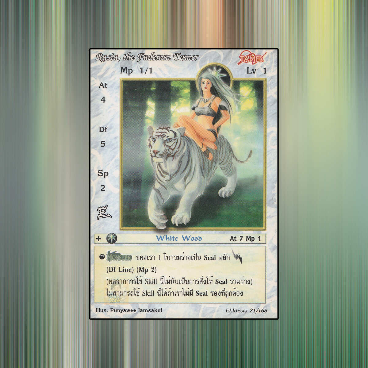 เป็นการ์ดเกม Summoner Master OG ในชุด Ekklesia นี้จะมีการ์ดทั้งหมด 168 แบบ Rasia, the Fudenun Tamer เป็น Seal Card ธาตุ Light เผ่าพันธุ์ Tamer หมายเลข 21 ระดับการค้นหา Common