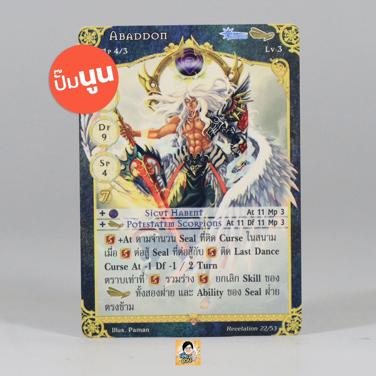 เป็นการ์ดเกม Summoner Master OG ในชุด Revelation นี้จะมีการ์ดทั้งหมด 54 แบบ “Abaddon” เป็น Seal Card ธาตุ Dark เผ่าพันธุ์ Divine Insect หมายเลข 22 ระดับการค้นหา Special