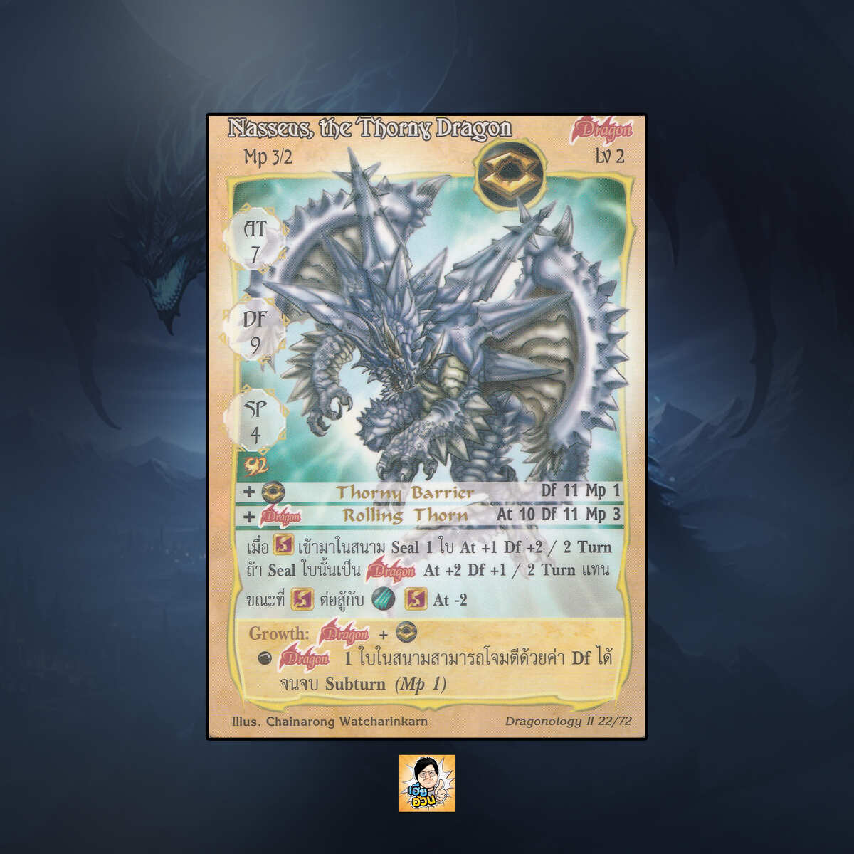 เป็นการ์ดเกม “Summoner Master OG” ในชุด “Dragonology 2” นี้จะมีการ์ดทั้งหมด 73 แบบ “Nasseus, the Thorny Dragon” เป็น Seal Card ธาตุ Earth เผ่าพันธุ์ Dragon หมายเลข 22 ระดับการค้นหา Special
