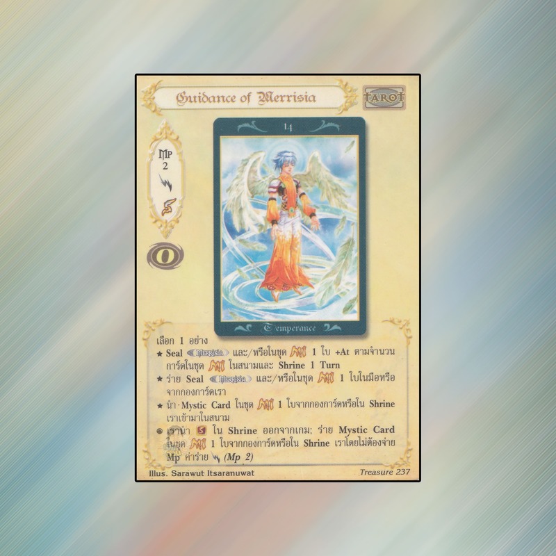 เป็นการ์ดเกม Summoner Master OG ในชุด Treasure นี้จะมีการ์ดทั้งหมด 314 ใบ Guidance of Merrisia เป็น Mystic Card ประเภทไพ่ทาโรต์ หมายเลข 237: ระดับการค้นหาเป็นการ์ดโปรโมชัน