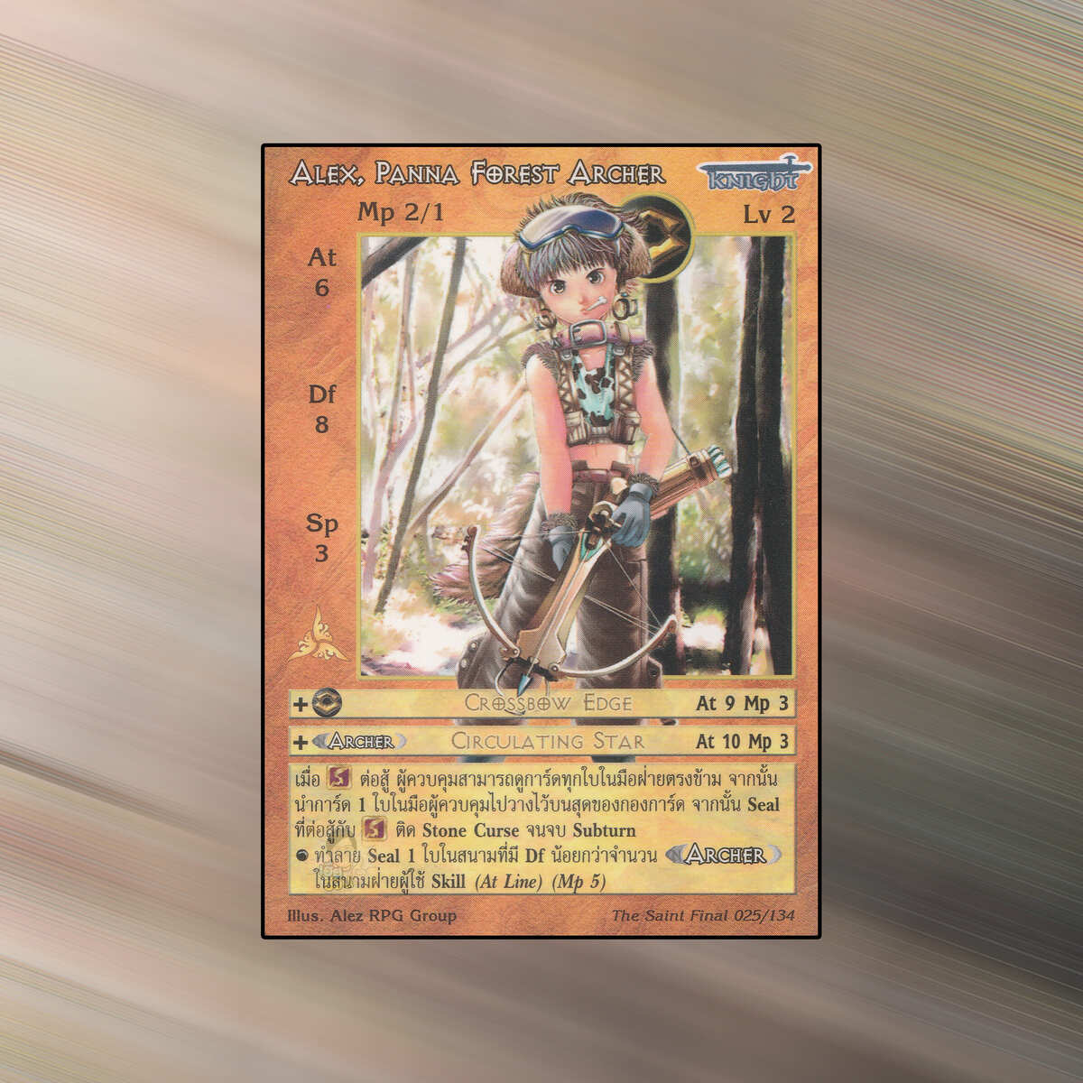 เป็นการ์ดเกม Summoner Master OG ในชุด The Saint Final นี้จะมีการ์ดทั้งหมด 135 แบบ Alex, Panna Forest Archer เป็น Seal Card ธาตุ Earth เผ่าพันธุ์ Knight หมายเลข 25 ระดับการค้นหา Rare