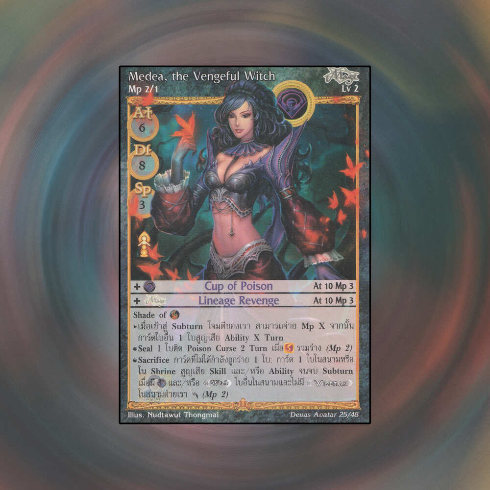 เป็นการ์ดเกม Summoner Master OG ในชุด Devas Avatar นี้จะมีการ์ดทั้งหมด 48 แบบ Medea, the Vengeful Witch เป็น Seal Card ธาตุแสง เผ่านักเวท หมายเลข 25: ระดับการค้นหาเป็นการ์ดพิเศษ