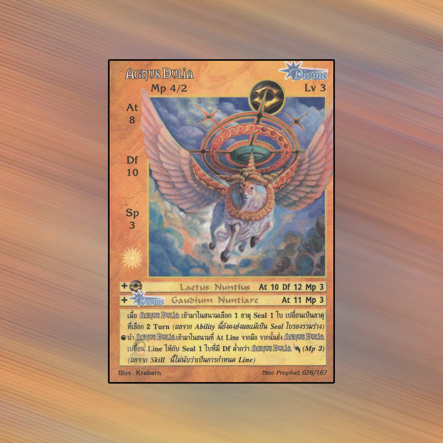 เป็นการ์ดเกม Summoner Master OG ในชุด Neo Prophet นี้จะมีการ์ดทั้งหมด 168 แบบ Agnus Dulia เป็น Seal Card ธาตุ Earth เผ่าพันธุ์ Divine หมายเลข 26 ระดับการค้นหา Rare