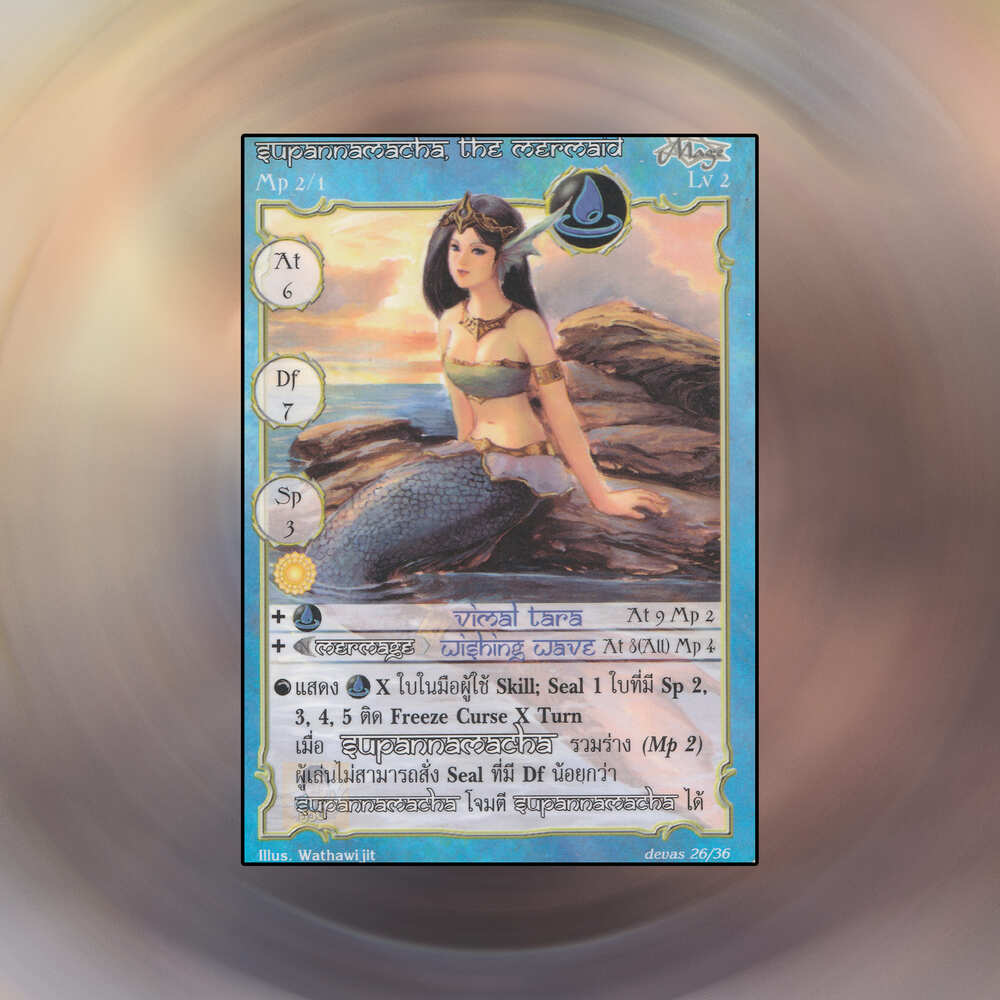เป็นการ์ดเกม Summoner Master OG ในชุด Devas นี้จะมีการ์ดทั้งหมด 36 แบบ Supannamacha, the Mermaid เป็น Seal Cards ธาตุน้ำ เผ่านักเวท หมายเลข 26: ระดับการค้นหาเป็นการ์ดพิเศษ