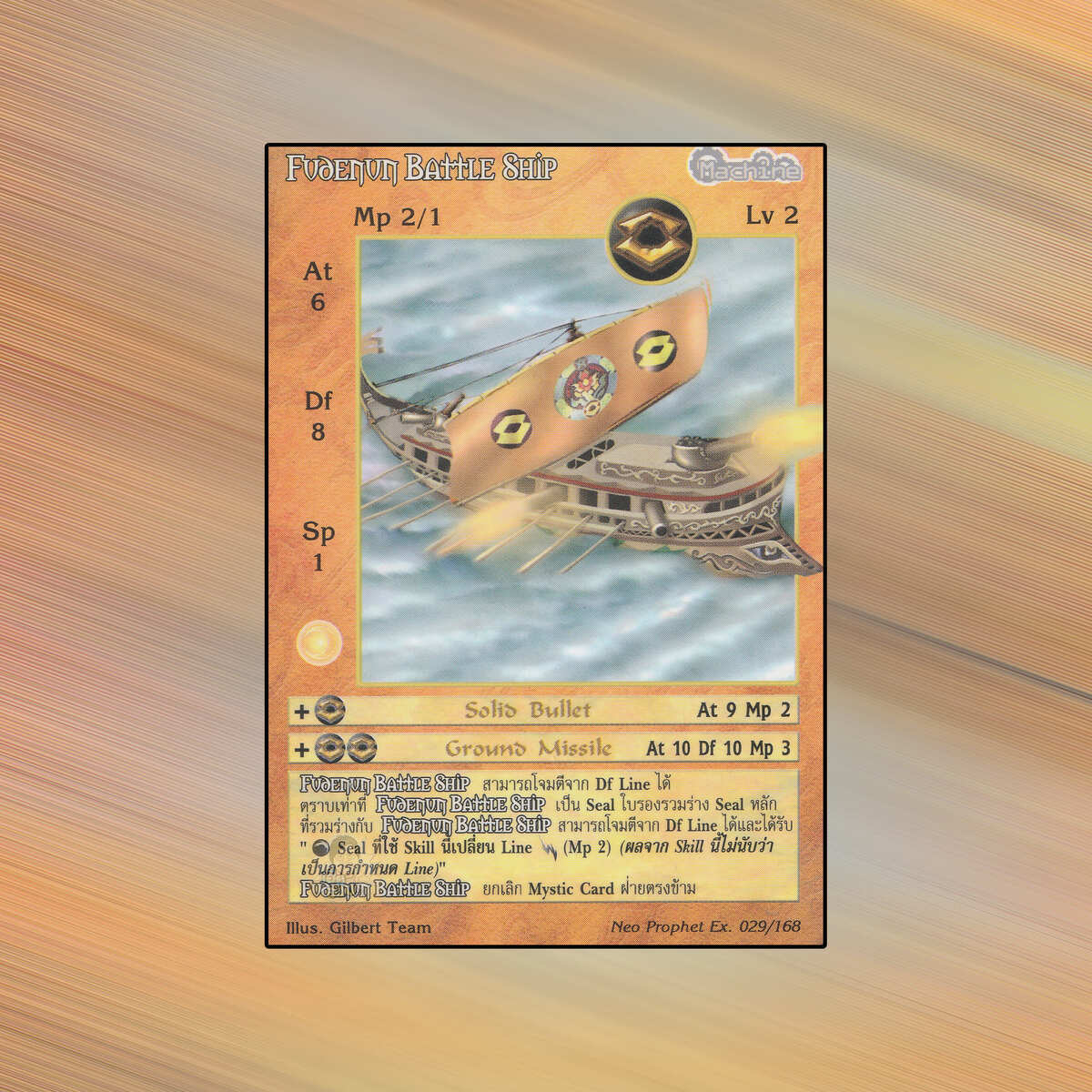 เป็นการ์ดเกม Summoner Master OG ในชุด Neo Prophet Extended นี้จะมีการ์ดทั้งหมด 169 แบบ “Fudenun Battle Ship” เป็น Seal Card ธาตุ Earth เผ่าพันธุ์ Machine หมายเลข 29 ระดับการค้นหา Rare
