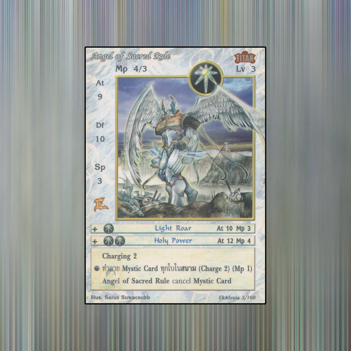 เป็นการ์ดเกม Summoner Master OG ในชุด Ekklesia นี้จะมีการ์ดทั้งหมด 168 แบบ Angel of Sacred Rule เป็น Seal Card ธาตุ Light เผ่าพันธุ์ Titan หมายเลข 3 ระดับการค้นหา Rare