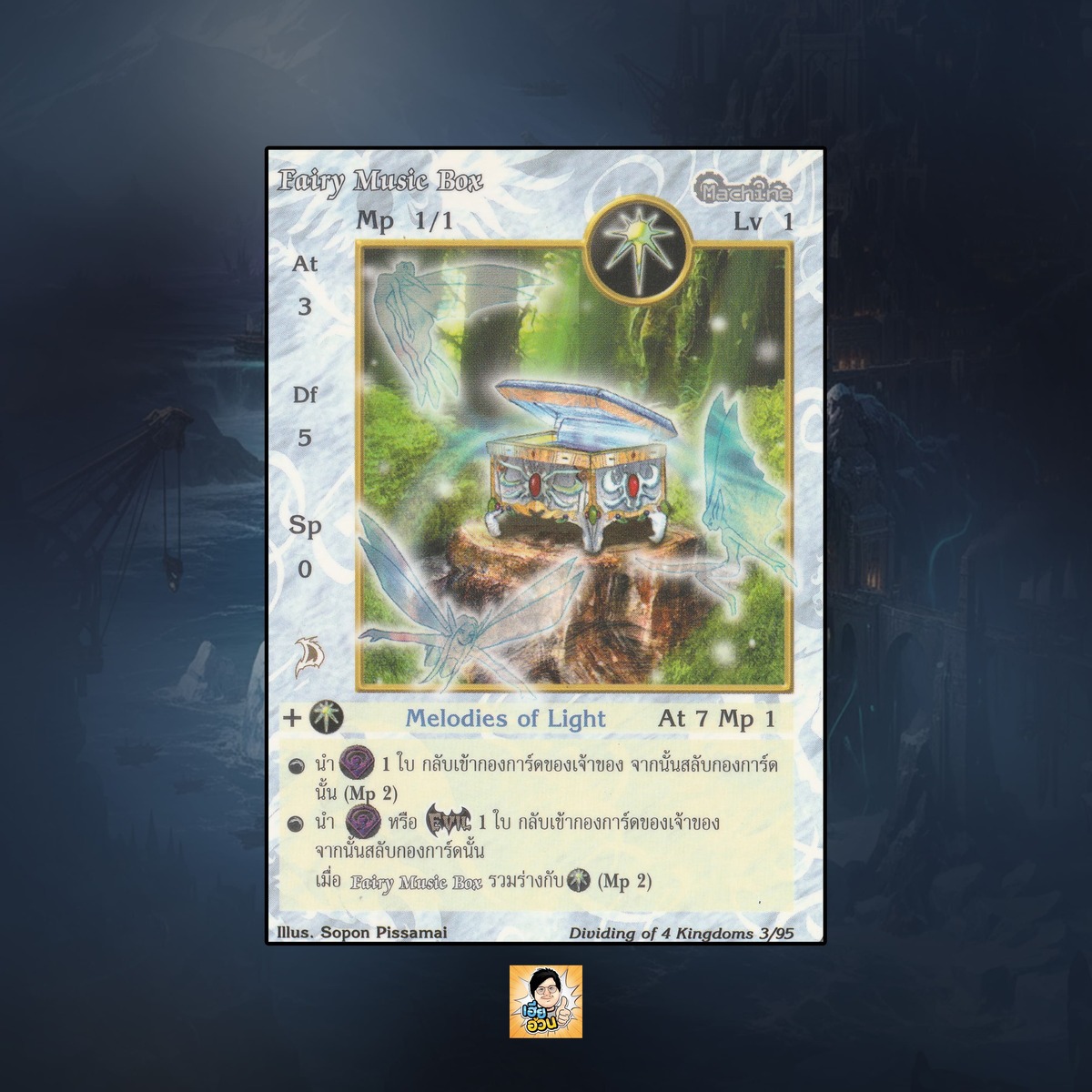ในชุด “Dividing of 4 Kingdoms” นี้จะมีการ์ดทั้งหมด 105 แบบ “Fairy Music Box” เป็น Seal Cards หมายเลข 3 ธาตุแสง เผ่าเครื่องจักรกล: ระดับการค้นหาเป็นทั่วไป