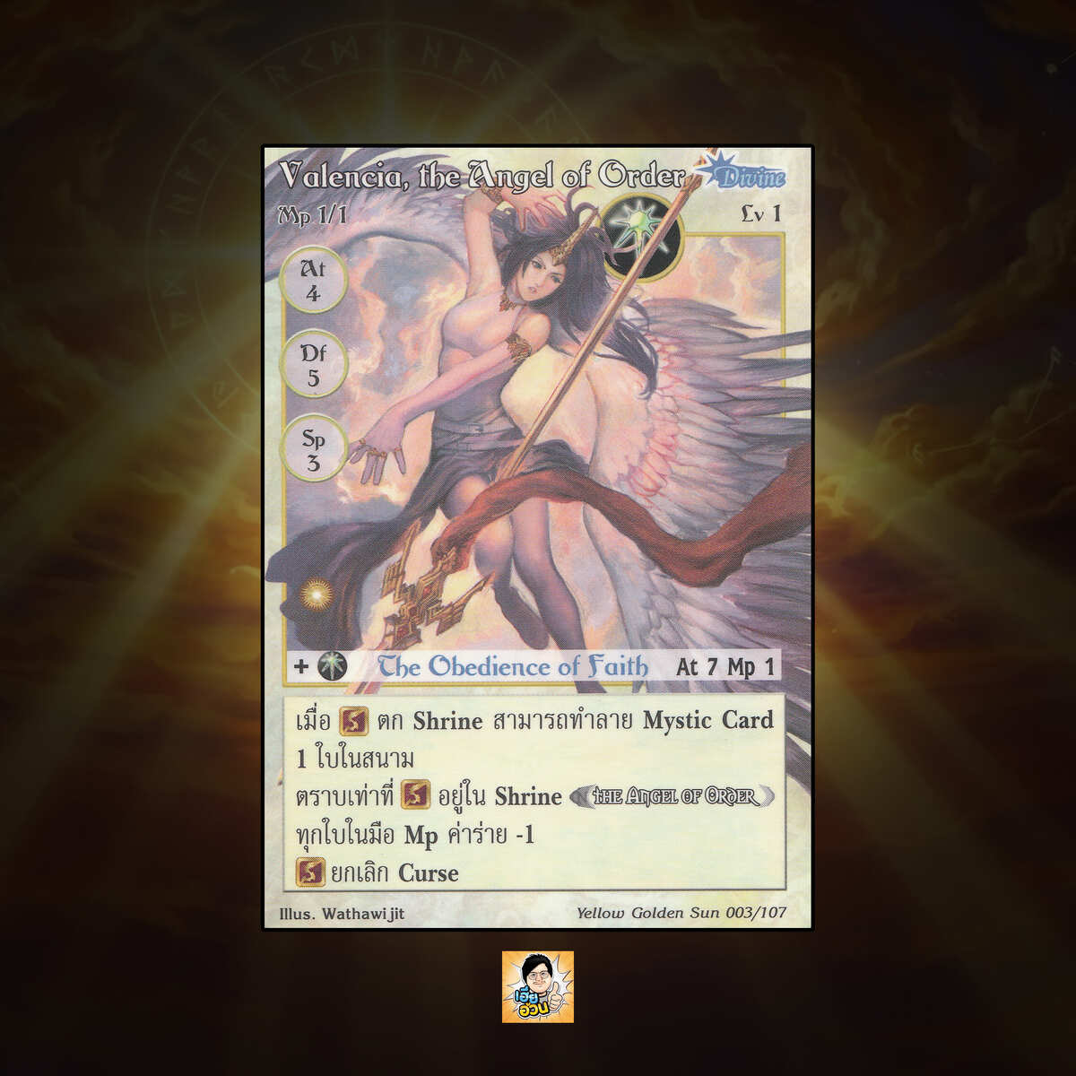 เป็นการ์ดเกม “Summoner Master OG” ในชุด “Yellow Golden Sun” นี้จะมีการ์ดทั้งหมด 108 แบบ “Valencia, the Angel of Order” เป็น Seal Card ธาตุ Light เผ่าพันธุ์ Divine หมายเลข 3 ระดับการค้นหา Rare
