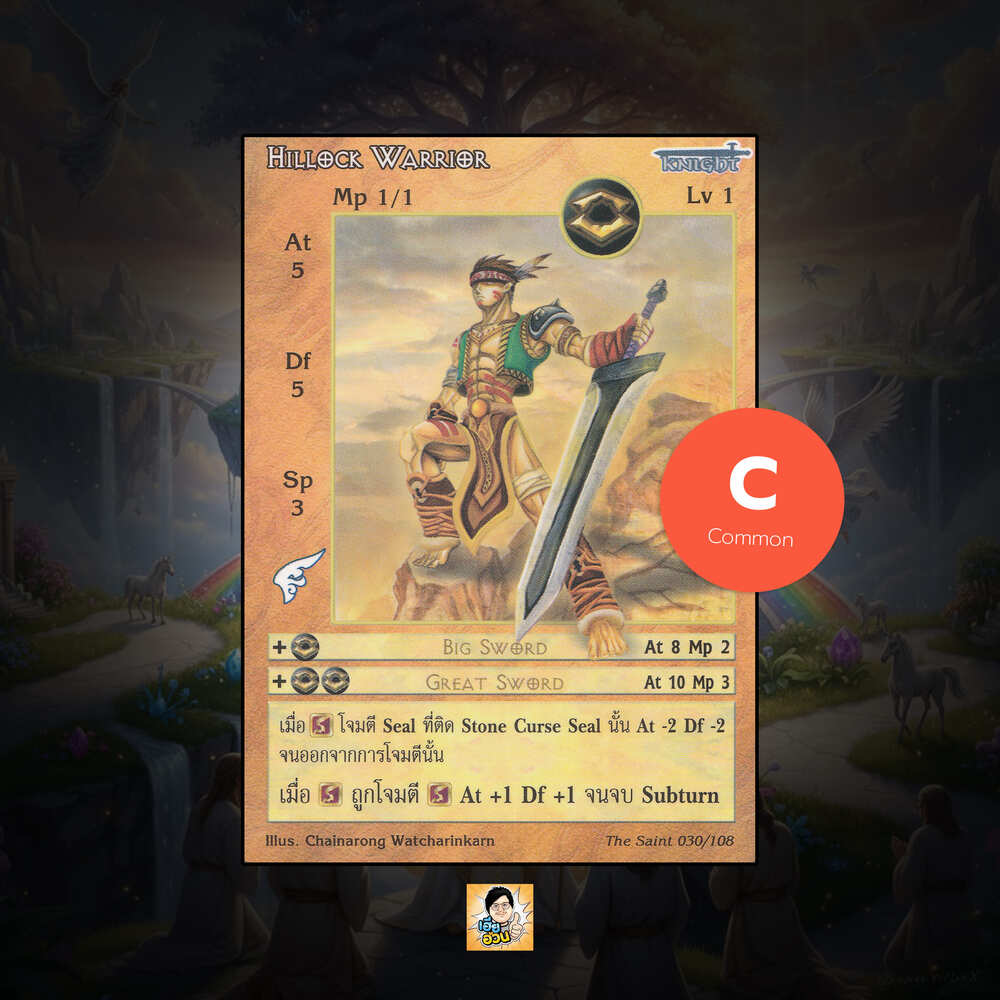 เป็นการ์ดเกม “Summoner Master OG” ในชุด “The Saint” นี้จะมีการ์ดทั้งหมด 108 แบบ “Hillock Warrior” เป็น Seal Card ธาตุ Earth เผ่าพันธุ์ Knight หมายเลข 30 ระดับการค้นหา Common